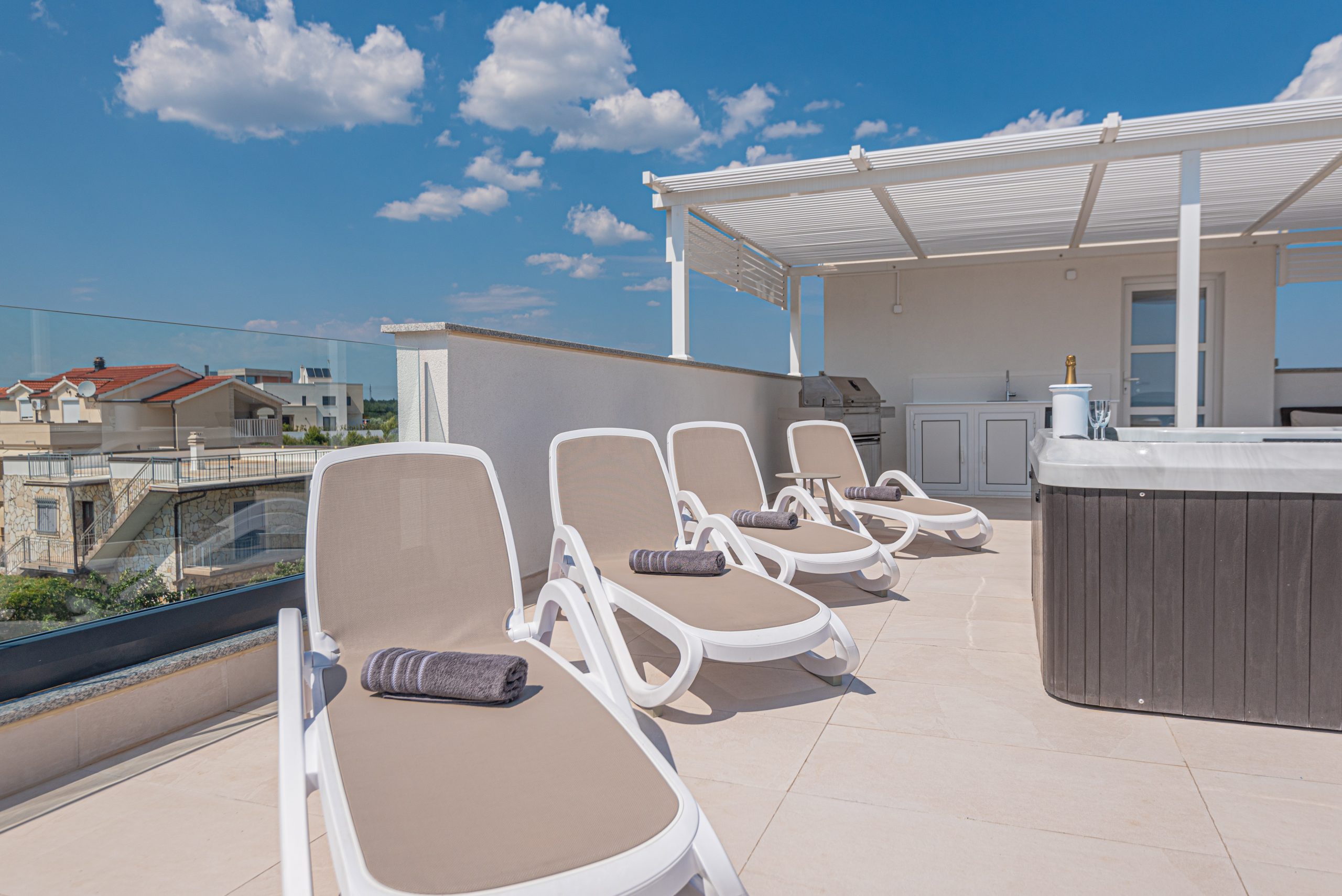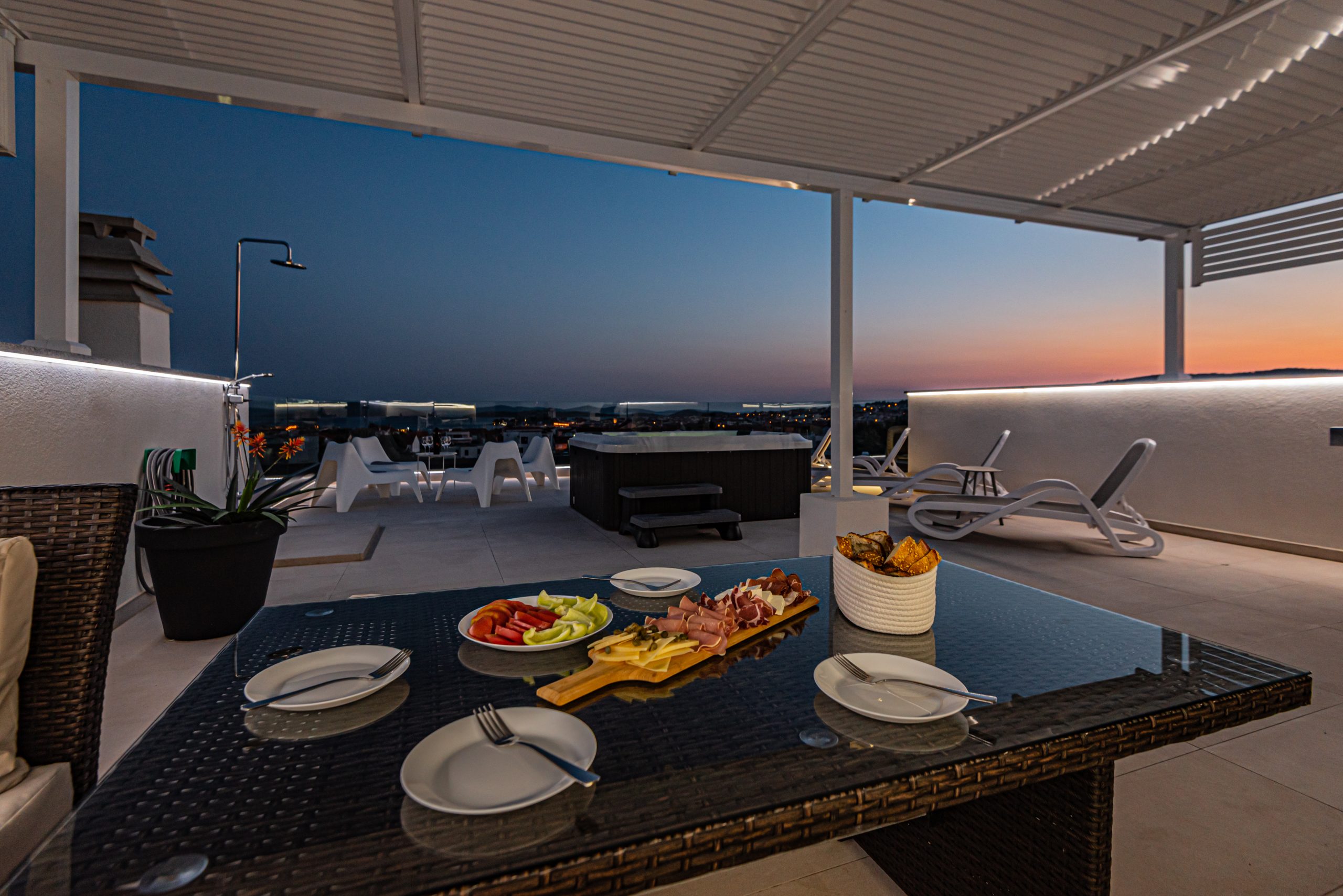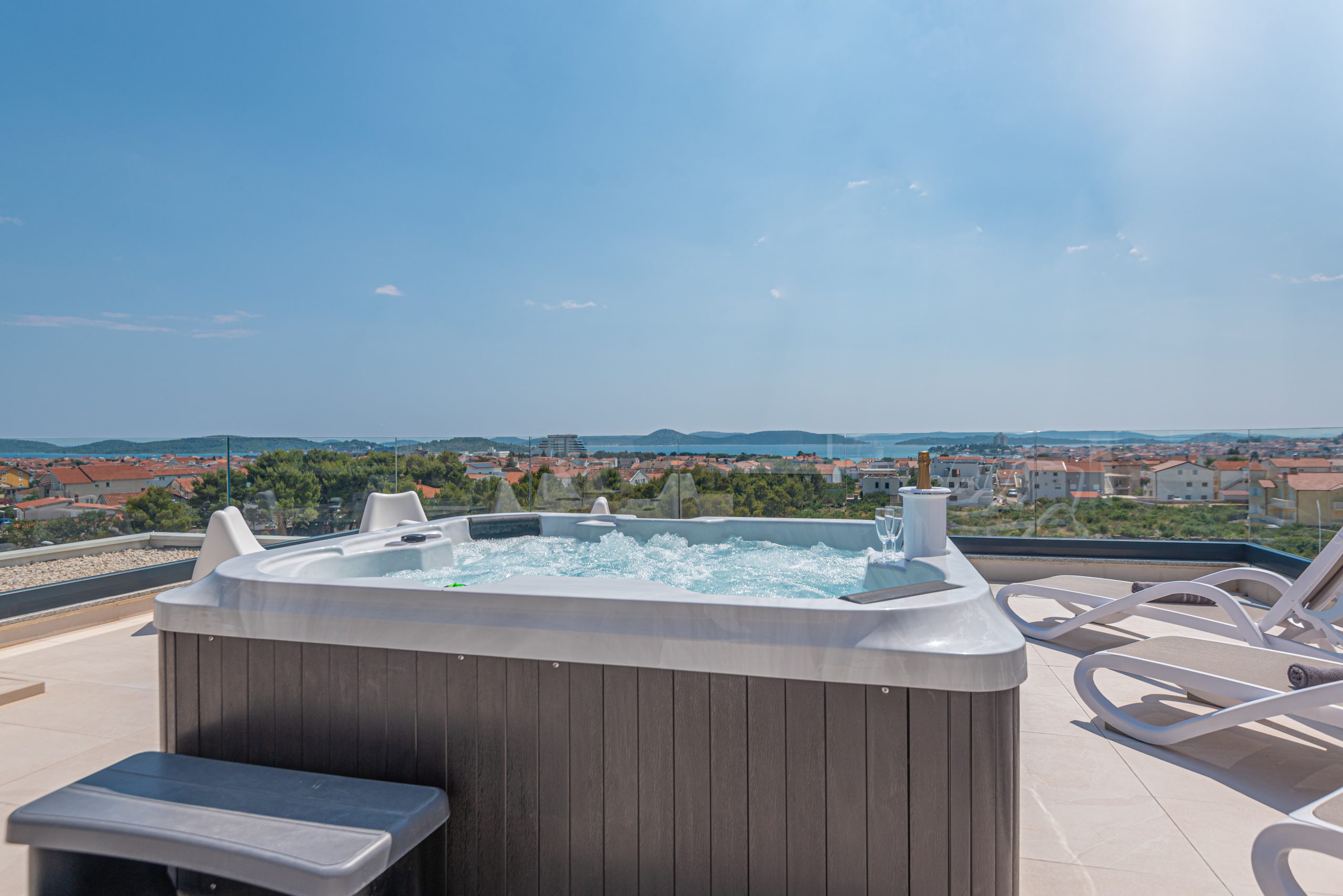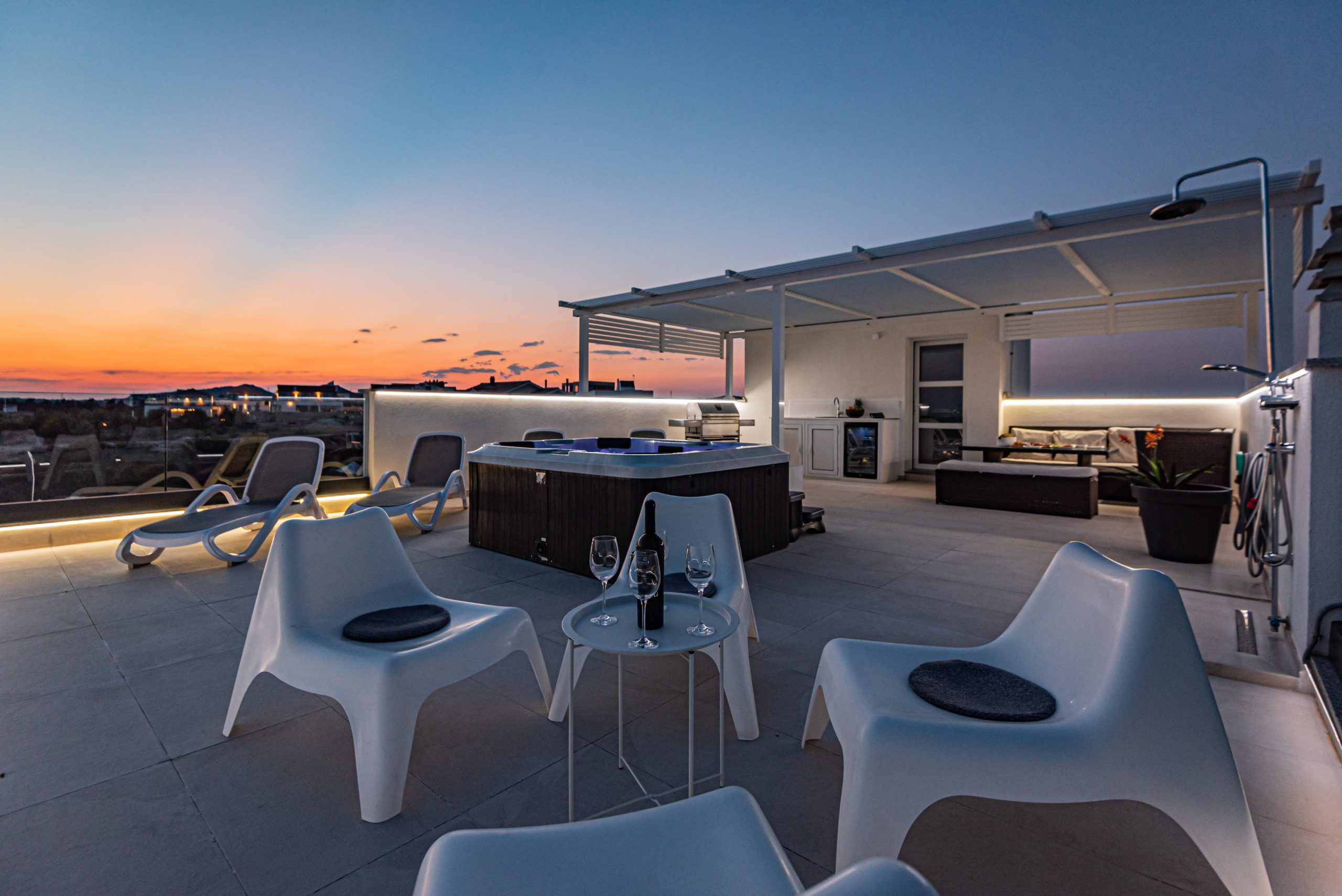 Apartman ima prostranu krovnu terasu s privatnim jacuzzijem, savršenu za opuštanje na otvorenom. Bilo da uživate u mirnoj jutarnjoj kavi ili večeri uz zalazak sunca – ovdje vas očekuje odmor na najvišoj razini.